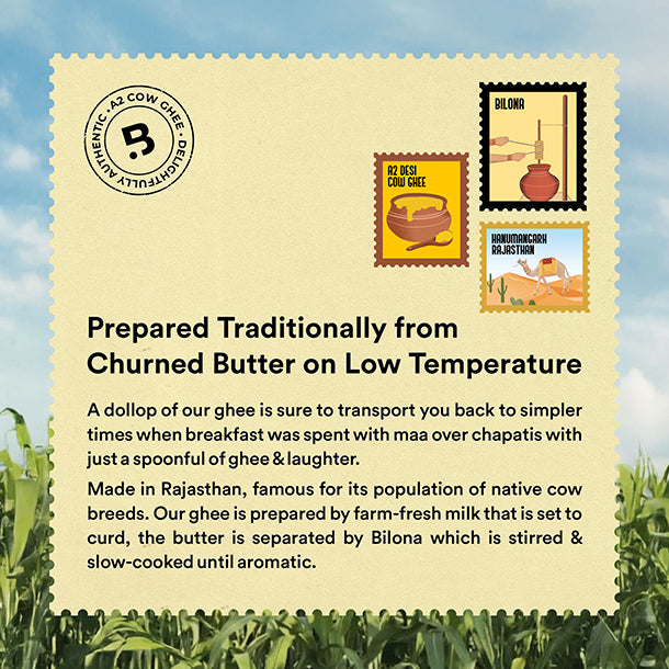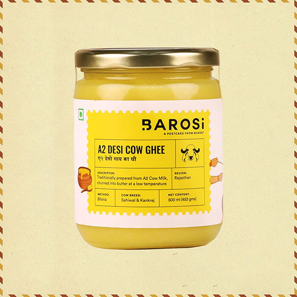 Prepared traditionally from churned butter, made from Sahiwal & Kankrej cows’ milk. Barosi’s A2 Desi Cow Ghee is pure, nutritious, and aromatic. Our Ghee is prepared using farm-fresh milk that is set to curd, and then the butter is separated through the bilona method, which is stirred & slow-cooked until aromatic. Filled with essential nutrients and vitamins, Ghee is a must-have for every individual. Enjoy it with your favorite meals.