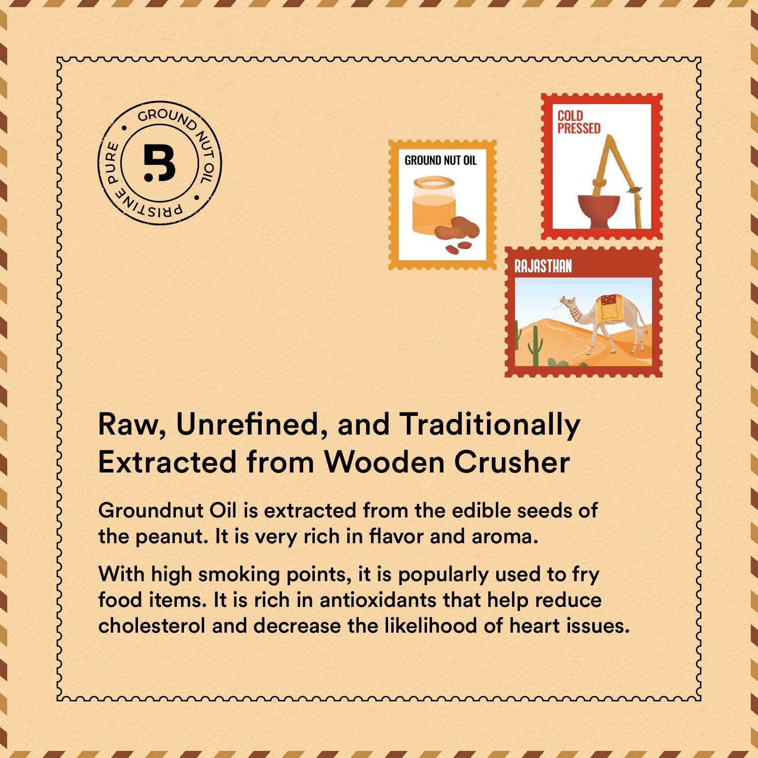 Extracted from peanuts of Rajasthan, Groundnut cold-pressed oil is raw, unrefined, and traditionally extracted from a wooden crusher. Our groundnut oil journey starts with sourcing the seeds from farms in Sikar, Rajasthan, and then, using wooden churners (kolhu) to extract the oil. It’s the most natural, ancient way of oil extraction, the entire process is completely chemical or preservative-free, giving you only the purest & most fragrant groundnut oil.