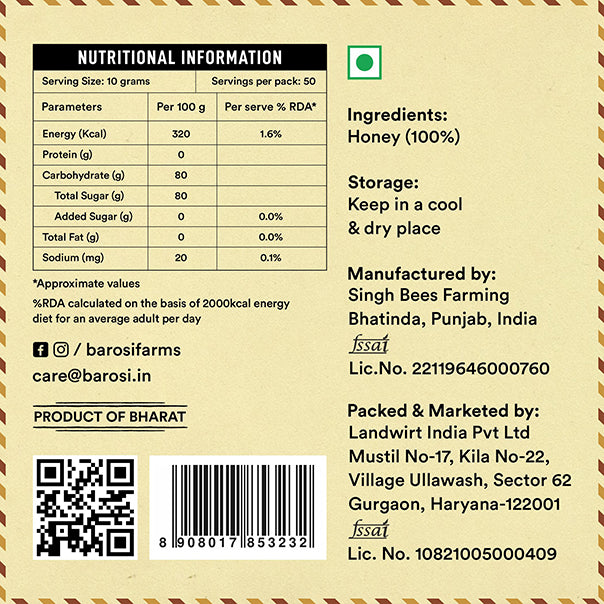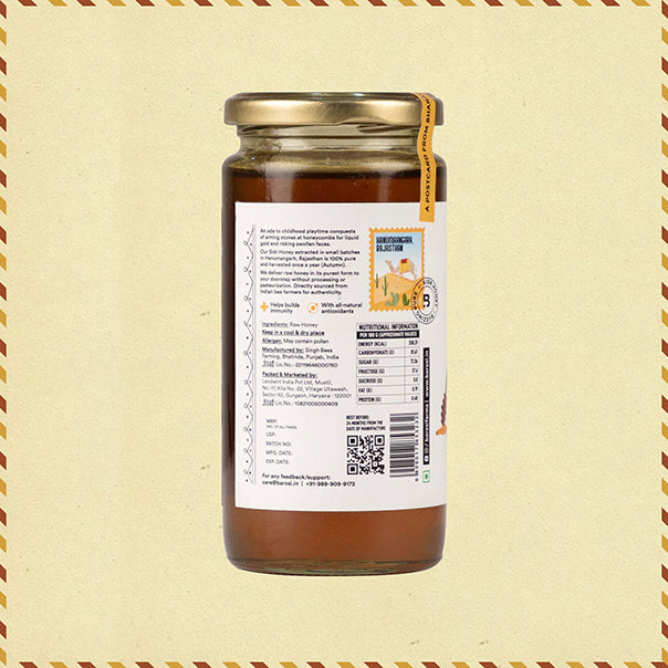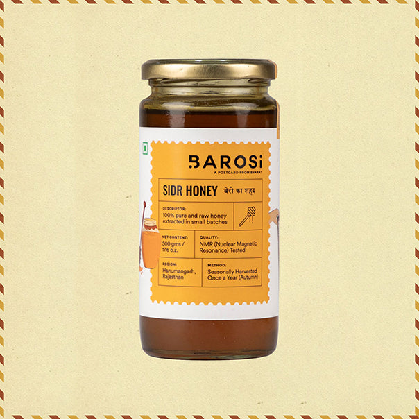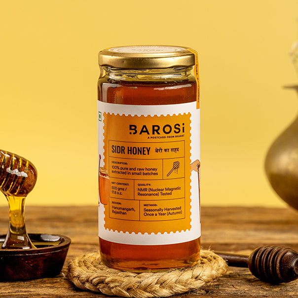 Directly sourced from bee farmers in Hanumangarh, Rajasthan, and seasonally harvested once a year (in autumn), we bring 100% pure and raw Sidr Honey in its most natural form. The honey is sourced from the bees that are found near the sidr trees. It is carefully extracted in small batches, once a year in Autumn, under our supervision. We only filter impurities at the farm, delivering the product in its as-is form without any processing. Sourced from the nectar of Sidr trees, this honey is packed with antioxidants, making it a perfect addition to your daily diet.