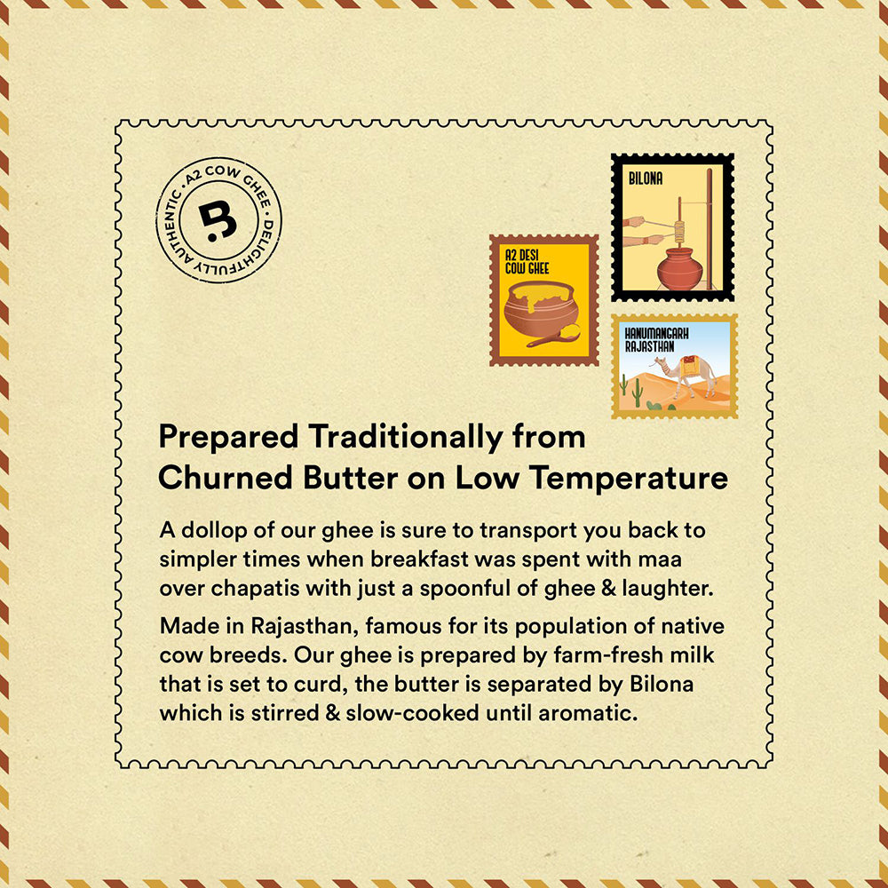 Prepared traditionally from churned butter, made from Sahiwal & Kankrej cows’ milk. Barosi’s A2 Desi Cow Ghee is pure, nutritious, and aromatic. Our Ghee is prepared using farm-fresh milk that is set to curd, and then the butter is separated through the bilona method, which is stirred & slow-cooked until aromatic. Filled with essential nutrients and vitamins, Ghee is a must-have for every individual. Enjoy it with your favorite meals.